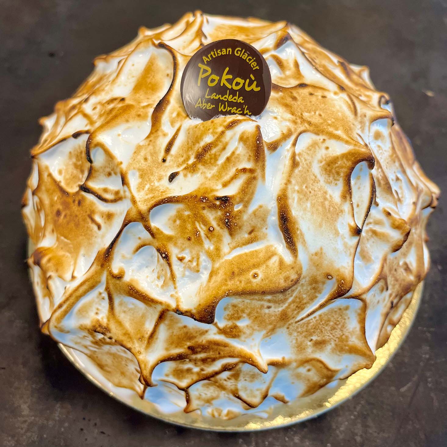 Crème glacée vanille, coeur sorbet framboise plein fruit, biscuit cuillère, meringue italienne